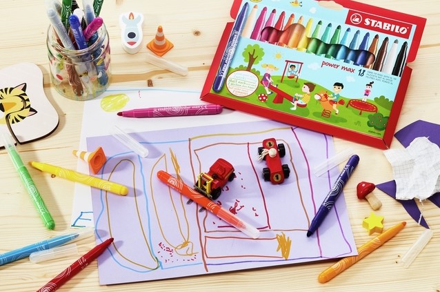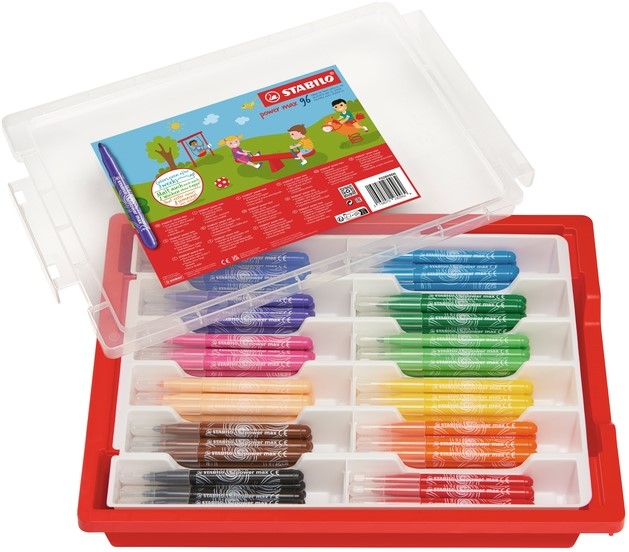 De STABILO Power max viltstiften hebben een bijzonder hoogwaardige en drukbestendige XL punt. Ze kunnen tot 8 weken zonder dop zonder uit te drogen. Ideaal voor kleine kinderen die de dop wel eens vergeten. Bovendien is de inkt in de pennen uitwasbaar - kleine vlekjes zijn dus geen probleem. Extra dikke viltstift STABILO power max Classpack met 140 kleurstiften.