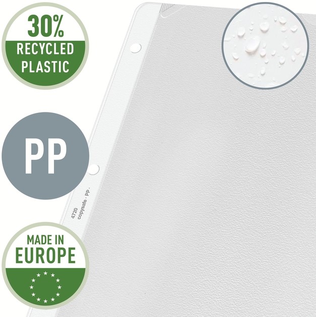 • Premium showtassen met een heldere matte afwerking, ideaal voor dagelijks gebruik thuis, op kantoor of op school. Met de 4-gaats versterkte strip kunnen documenten gemakkelijk worden opgeborgen in ordners en ringbanden en worden ze beschermd tegen vocht, stof en vuil. Opent aan de bovenkant voor eenvoudige toegang tot documenten zonder dat je de ordner of ringband open hoeft te maken. Het copysafe en zuurvrije materiaal zorgt voor een langdurige bescherming van de documenten. Gemaakt van PP (polypropyleen) plastic met 30% pre-consumer content en 100% recyclebaar.