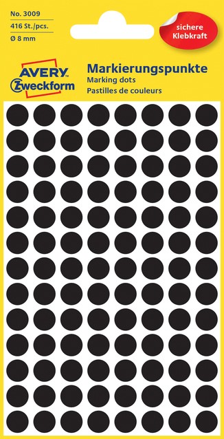 Etiket Avery 3009 rond 8mm zwart 416st 4 Vel