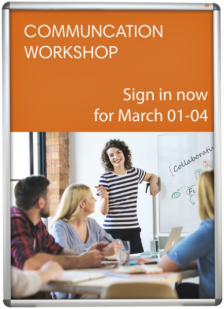 • Wandgemonteerd poster frame voor het veilig ophangen van posters, borden en informatie. De handige aluminium clicklijst zorgt voor een professionele afwerking en maakt het mogelijk snel en eenvoudig de inhoud te wisselen.