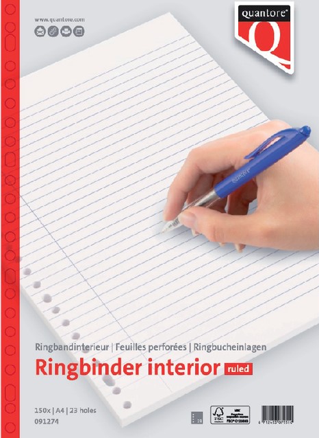 • Het interieur Quantore A4 23-gaats lijn 150vel is ideaal voor wie graag georganiseerd en overzichtelijk werkt. Dankzij de 23-gaats perforatie past dit gelinieerde papier perfect in A4-ringbanden en ordners met multiringmechaniek. De afmeting van 220x297 mm is inclusief perforatierand, waardoor je optimaal gebruik maakt van de schrijfruimte. Met 150 vellen van 70 grams papier heb je voldoende voorraad voor aantekeningen, notulen of studie. Het papier is FSC-gecertificeerd en draagt zo bij aan een verantwoorde omgang met grondstoffen. Een betrouwbare keuze voor school, kantoor of thuisgebruik.Kenmerken: