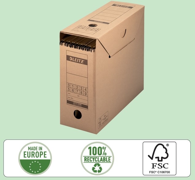 • Hoogste kwaliteit golfkarton maakt de archiefdoos sterk en stabiel, maar ook licht 100% recyclebaar product, FSC® gecertificeerd.