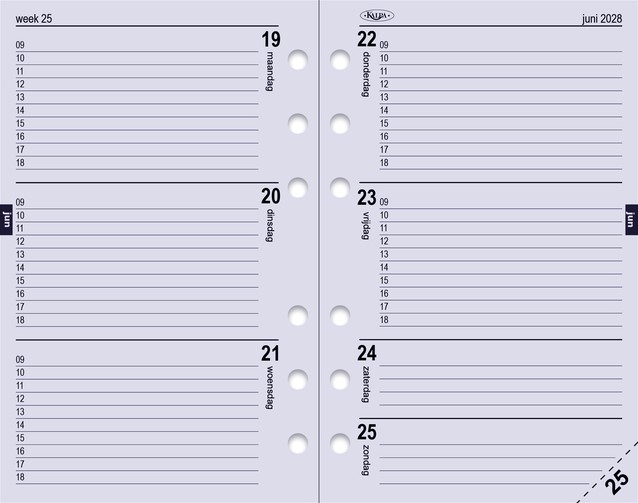 • U krijgt 160 pagina's wit papier met blauwe opdruk, met één week op 2 pagina's en een voorgedrukte tijdsindeling van 9:00 uur tot 18:00 uur.