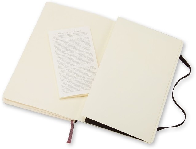 • Het boek beschikt over een gebonden, kartonnen kaft met afgeronde hoeken, zuurvrij papier, een bladwijzer, een elastische sluiting en een uitbreidbaar binnenvak met een tekst over de geschiedenis van Moleskine.
