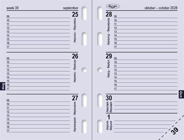 • U krijgt 160 pagina's wit papier met blauwe opdruk, met één week per pagina en tijdsindeling van 9:00 uur tot 18:00 uur.