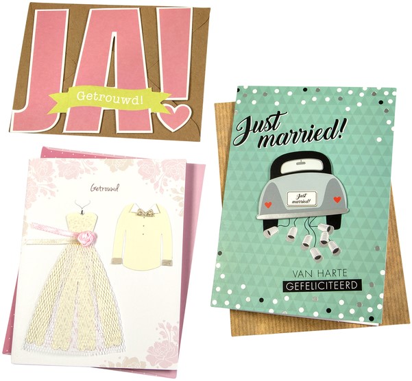 • Wenskaart om het gelukkige bruidspaar te feliciteren met hun huwelijk.
