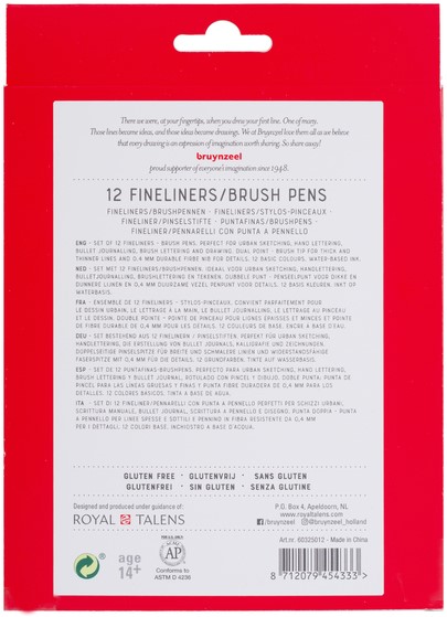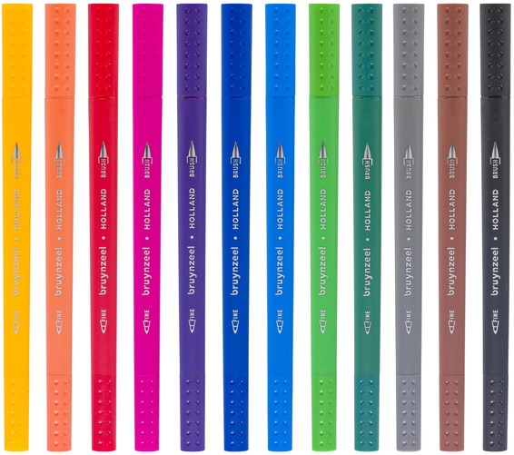• De basisset van Bruynzeel Creatives betreft een set van 12 fineliners/brushpens. Ideaal voor urban sketching, handlettering, bulletjournaling, brushlettering en tekenen.