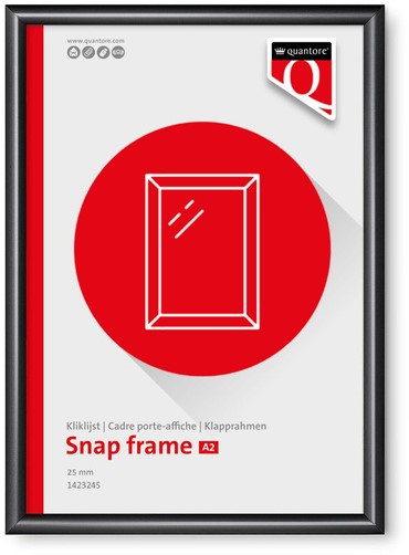 • Met de Quantore Premium kliklijst in A2-formaat geef je je posters en documenten een strakke en professionele presentatie. Het hoogwaardige aluminium frame in zwart zorgt voor een moderne en elegante uitstraling, ideaal voor kantoren, winkels en openbare ruimtes. De transparante ontspiegelende folie beschermt je inhoud en zorgt voor optimale zichtbaarheid zonder storende reflecties. Met een randbreedte van 25 mm en verborgen montagegaten biedt deze kliklijst een nette afwerking. Het meegeleverde ophangmateriaal maakt eenvoudige montage aan de muur mogelijk, zodat je snel en eenvoudig kunt wisselen van poster. Kenmerken: