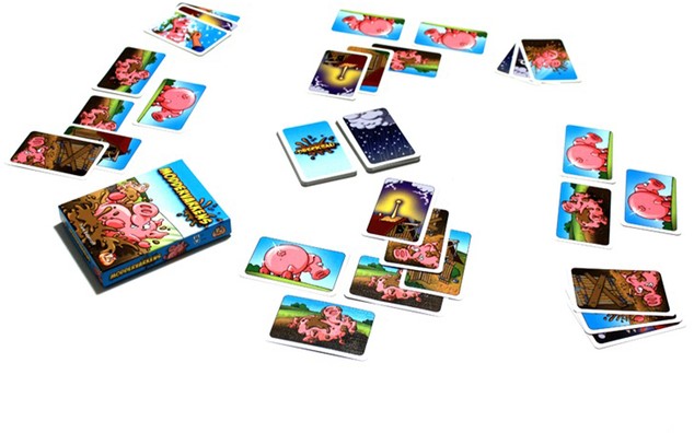 Laat jouw varkens lekker in de modder spelen, maar zorg ervoor dat die van anderen schoon blijven. De waterslang, een regenbui of een stal afbranden… niks is te gek om een ander te dwarsbomen. In ‘Moddervarkens’ probeert iedere speler zijn varkens te laten spelen in de modder om ze lekker vies te maken. Maar pas op, want je tegenstanders zullen alles in het werk stellen om jouw varkens weer schoon te wassen. Een stal komt dus goed van pas, want een dak biedt sowieso bescherming tegen regenkaarten. En als je de deur dan ook nog eens dicht laat timmeren, dan kan geen boer binnenkomen om jouw varkens schoon te boenen. De speler die uiteindelijk alleen maar moddervarkens voor zich op tafel heeft liggen, wint het spel! Dus ga dat varkentje van je tegenstanders maar eens wassen! Inhoud van het spel: 66 kaarten, spelregels