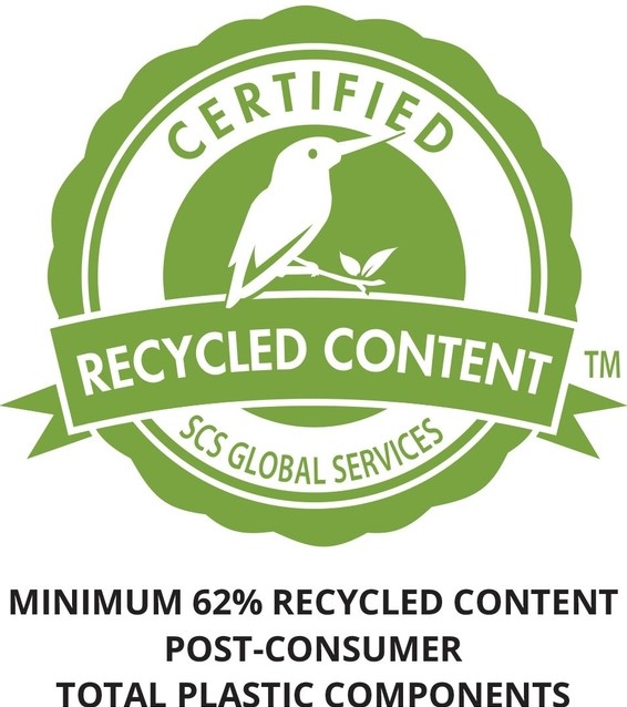 • Gecertificeerd gerecycled materiaal dat voldoet aan de SCS Recycled Content Standard V8-0 voor minimaal 62% post-consumer recycled content van de totale plastic onderdelen en geleverd in verpakkingen die zijn gecertificeerd door de Forest Stewardship Council (FSC®). Met uitzondering van de printplaat, 2,4 GHz dongle en batterij.