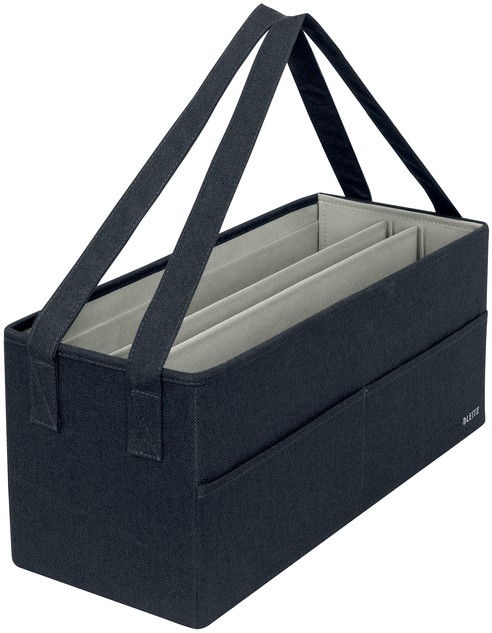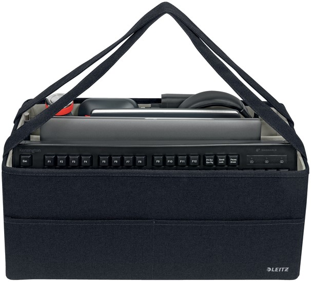 • Met zijn minimalistische ontwerp en uitnodigende matgrijze fluwelen afwerking kan je stijlvol en georganiseerd voor de dag komen op kantoor, thuis en onderweg. De Leitz stoffen Hot Desking opbergtas heeft drie aparte compartimenten waarin je alles wat je nodig hebt voor de komende dag kunt opbergen en meenemen. Deze moderne en praktische opbergtas heeft genoeg ruimte voor een laptop, toetsenbord, muis, oplaadkabels, headset, notitieblok en een waterfles. Hij past in elk standaard kastje of locker met minimale afmetingen van 480 x 210 mm en een hoogte van 220 mm en is ook geschikt als lerarentas. Gemaakt van zacht materiaal dat is versterkt met gerecycled karton voor stevigheid en duurzaamheid. Totaal 57% gerecycled materiaal. De opvouwbare opbergtas is volledig inklapbaar zodat hij gemakkelijk kan worden opgeborgen als hij niet wordt gebruikt. Deze Hot Desking opbergtas met 2 draagriemen is de perfecte aanvulling voor thuis, kantoor of op school om ervoor te zorgen dat je de hele dag ontspannen en productief blijft.