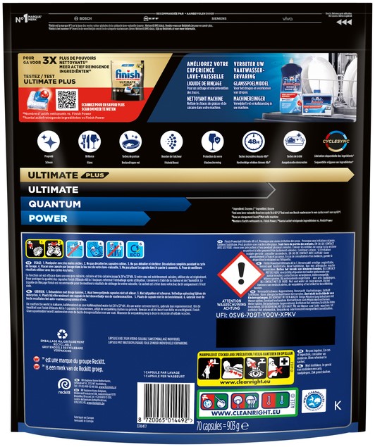 • Met Finish Ultimate all in one vaatwascapsules krijg je bij elke wasbeurt vanaf de eerste keer ultieme glans en uitzonderlijke reiniging! Onze ACTIVELIFT -technologie is effectief tegen alle soorten voedselresten, zelfs hardnekkige vlekken gedurende 48 uur, zonder voorspoelen. Onze capsules beschermen en verzorgen je vaat en zorgen ervoor dat je vaat blijft glanzen, was na was.