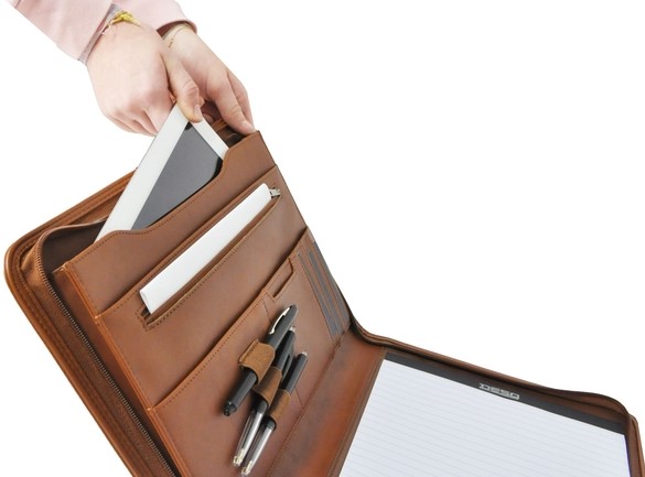 • Deze Business Classy conferentiemap is handgemaakt van hoogwaardig kunstleer in Dutch Design.Bevat 8 opberg- en insteekvakken , waarin accessoires zoals pennen, visitekaartjes en documenten opgeborgen kunnen worden. Eén vak is geschikt voor een tablet, maar kan ook gebruikt worden als opbergvak voor A4 documenten. Business Classy conferentiemappen combineren praktisch gebruik met een luxe en minimalistisch Dutch Design. Voor een professionele en stijlvolle indruk bij elke gelegenheid. Met de verscheidenheid aan goed doordachte vakken neem je jouw documenten overzichtelijk geordend mee naar iedere afspraak. Door de rondom lopende ritssluiting kun je de schrijfmap volledig afsluiten. Zo kun je de schrijfmap overal mee naar toe nemen zonder het risico te lopen iets te verliezen.