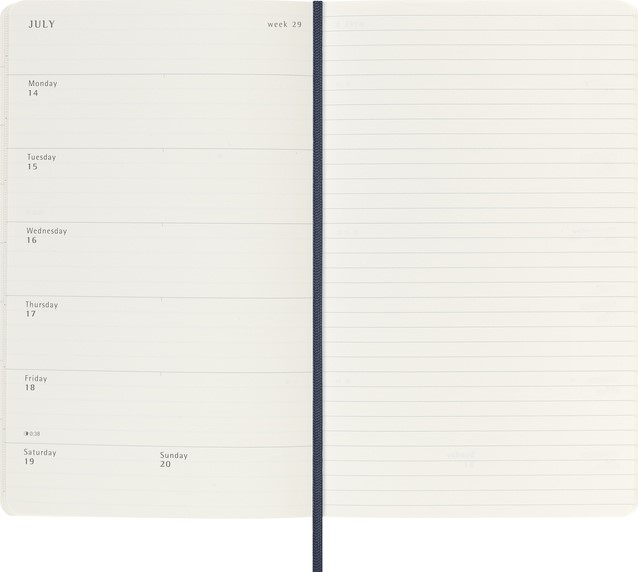 De Moleskine 18 Maanden Weekly Notebook Planner loopt van juli tot december. Deze populaire planner is ingedeeld om de afspraken van de week aan de linkerkant weer te geven en heeft een gelinieerde pagina voor notities en ideeën aan de rechterkant. Hierdoor is het notebook perfect voor studenten, docenten en professionals. De planner heeft een harde of zachte kaft met afgeronde hoeken en een elastische sluiting.