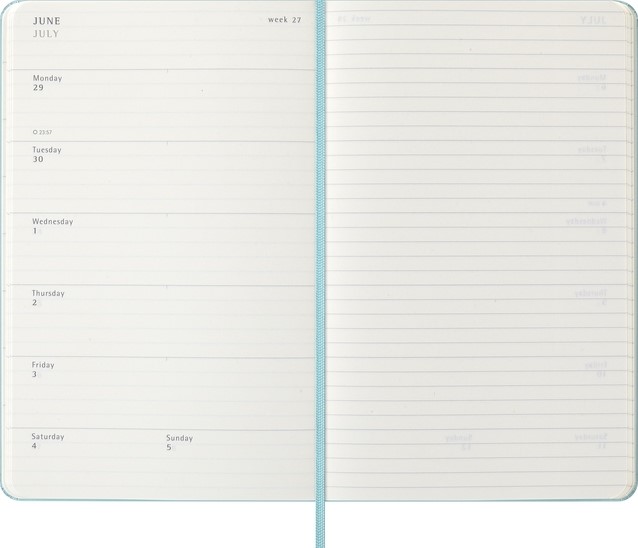 De Moleskine 18 Maanden Weekly Notebook Planner loopt van juli tot december. Deze populaire planner is ingedeeld om de afspraken van de week aan de linkerkant weer te geven en heeft een gelinieerde pagina voor notities en ideeën aan de rechterkant. Hierdoor is het notebook perfect voor studenten, docenten en professionals. De planner heeft een harde of zachte kaft met afgeronde hoeken en een elastische sluiting. - Harde kaft - Afgeronde hoeken - Elastische sluiting - Moleskine ivoorkleurig papier - Papiergewicht: 70 g/m² - Handige tools: planning, tijdzones, internationale metingen, toegangscodes en vluchtduur - Wereldwijde feestdagenkalender verkrijgbaar via moleskine.com/diaryaddons - Uitbreidbaar binnenvak passend bij de kleur van het notebook - "In geval van verlies" label gedrukt op het schutblad - Bijpassende bladwijzer voor lint - Herbruikbare paperband B-SIDE met extra gedrukte tools - 180° liggende opening - Moleskine srl. creëert en verkoopt FSC-gecertificeerde producten