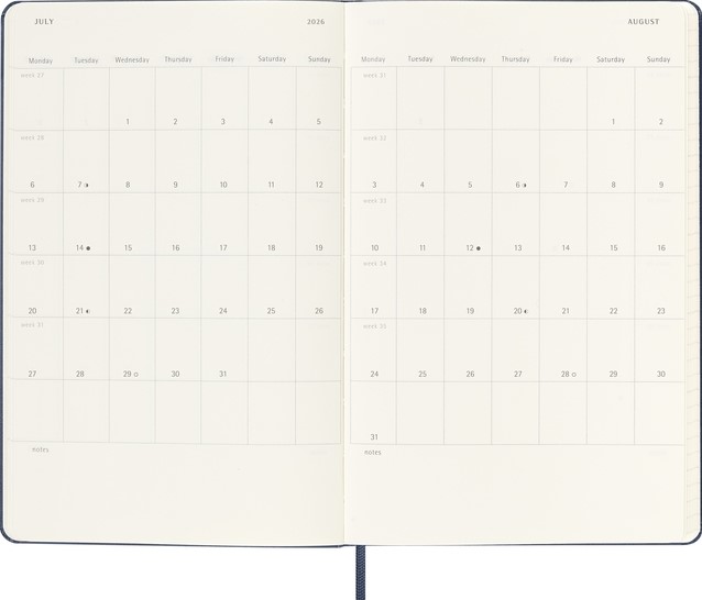 De Moleskine 18 Maanden Weekly Notebook Planner loopt van juli tot december. Deze populaire planner is ingedeeld om de afspraken van de week aan de linkerkant weer te geven en heeft een gelinieerde pagina voor notities en ideeën aan de rechterkant. Hierdoor is het notebook perfect voor studenten, docenten en professionals. De planner heeft een harde of zachte kaft met afgeronde hoeken en een elastische sluiting.