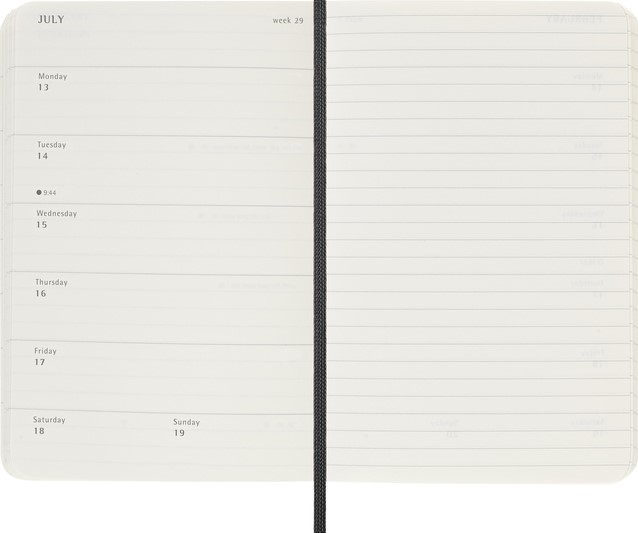 De Moleskine 18 Maanden Weekly Notebook Planner loopt van juli tot december. Deze populaire planner is ingedeeld om de afspraken van de week aan de linkerkant weer te geven en heeft een gelinieerde pagina voor notities en ideeën aan de rechterkant. Hierdoor is het notebook perfect voor studenten, docenten en professionals. De planner heeft een harde of zachte kaft met afgeronde hoeken en een elastische sluiting.