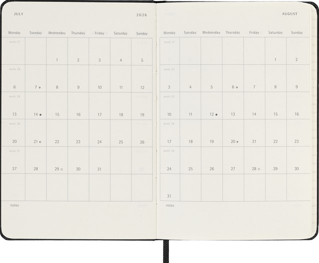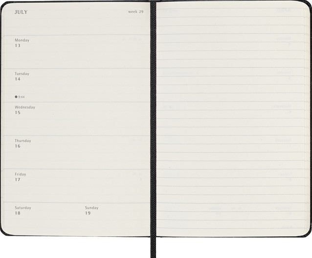 De Moleskine 18 Maanden Weekly Notebook Planner loopt van juli tot december. Deze populaire planner is ingedeeld om de afspraken van de week aan de linkerkant weer te geven en heeft een gelinieerde pagina voor notities en ideeën aan de rechterkant. Hierdoor is het notebook perfect voor studenten, docenten en professionals. De planner heeft een harde of zachte kaft met afgeronde hoeken en een elastische sluiting.