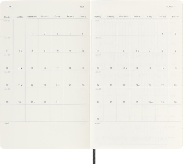 De Moleskine 18 Maanden Weekly Notebook Planner loopt van juli tot december. Deze populaire planner is ingedeeld om de afspraken van de week aan de linkerkant weer te geven en heeft een gelinieerde pagina voor notities en ideeën aan de rechterkant. Hierdoor is het notebook perfect voor studenten, docenten en professionals. De planner heeft een harde of zachte kaft met afgeronde hoeken en een elastische sluiting.