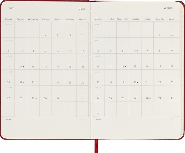 De Moleskine Weekly Notebook Planner is gedateerd van januari tot december. Het is een handige en veelzijdige planner die de vrijheid van een notitieboekje bevat en is ingedeeld met de afspraken van de week aan de linkerkant en een gelinieerde pagina voor notities op de rechter bladzijde. Het notitieboekje is beschikbaar met een harde of een zachte kaft met afgeronde hoeken en een elastische sluiting. - Harde kaft - Afgeronde hoeken - Elastische sluiting - Moleskine ivoorkleurig papier - Papiergewicht: 70 g/m² - Handige tools: planning, tijdzones, internationale metingen, toegangscodes en vluchtduur - Uitbreidbaar binnenvak passend bij de kleur van het notebook - "In geval van verlies" label gedrukt op het schutblad - Bijpassende bladwijzer voor lint - Herbruikbare paperband B-SIDE met extra gedrukte tools - 180° liggende opening - Moleskine srl. creëert en verkoopt FSC-gecertificeerde producten