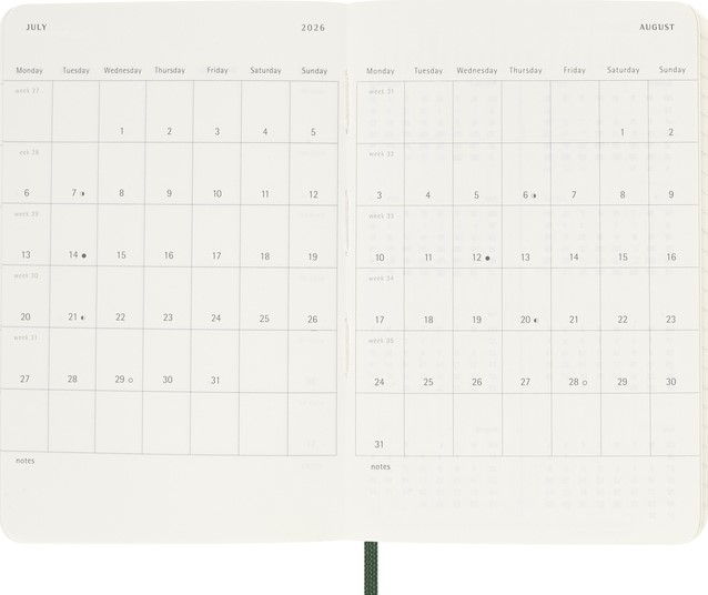 De Moleskine Weekly Notebook Planner is gedateerd van januari tot december. Het is een handige en veelzijdige planner die de vrijheid van een notitieboekje bevat en is ingedeeld met de afspraken van de week aan de linkerkant en een gelinieerde pagina voor notities op de rechter bladzijde. Het notitieboekje is beschikbaar met een harde of een zachte kaft met afgeronde hoeken en een elastische sluiting. - Zachte kaft - Afgeronde hoeken - Elastische sluiting - Moleskine ivoorkleurig papier - Papiergewicht: 70 g/m² - Handige tools: planning, tijdzones, internationale metingen, toegangscodes en vluchtduur - Uitbreidbaar binnenvak passend bij de kleur van het notebook - "In geval van verlies" label gedrukt op het schutblad - Bijpassende bladwijzer voor lint - Herbruikbare paperband B-SIDE met extra gedrukte tools - 180° liggende opening - Moleskine srl. creëert en verkoopt FSC-gecertificeerde producten