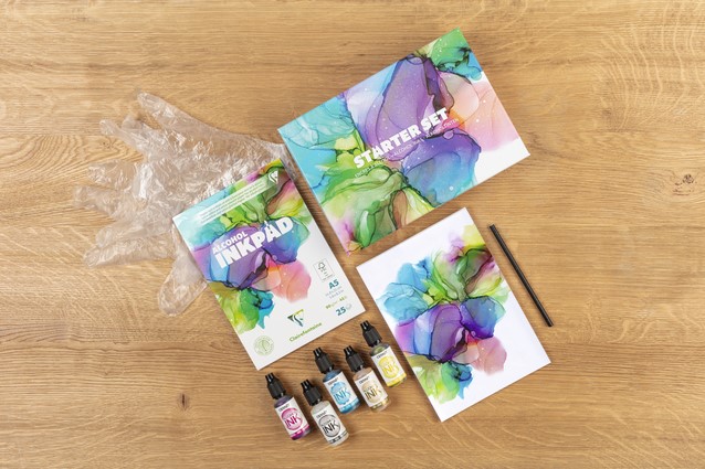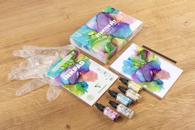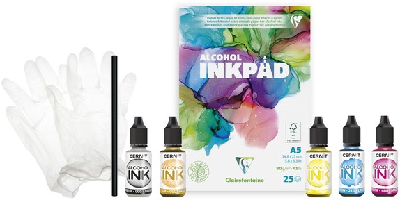 Koffer Starterset Alcohol Ink A5 Alcohol Inkpad blok Clairefontaine en Cernit alcoholinkt In samenwerking met Cernit. Ideaal cadeau om de techniek van schilderen met alcoholinkten te ontdekken! Deze complete set bevat al het materiaal dat nodig is voor de techniek van schilderen met alcoholinkt. Inhoud: 1 Alcohol Inkpad blok met 25 niet-absorberende vellen A5 van 100g, 4 Cernit alcoholinkten, 1 Cernit verdunner om de kleuren van de alcoholinkten te verdunnen en te verfijnen, 1 paar handschoenen en 1 rietje om de alcoholinkten te verspreiden. EXTRA: een kaartje met een QR-code die toegang geeft tot een exclusieve stap-voor-stap video.