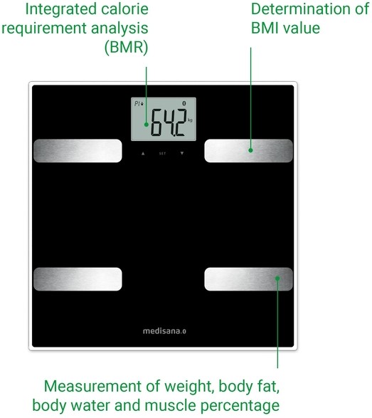 • Naast gewichts- en lichaamsgegevens bepaalt de medisana BS A41 connect body composition monitor ook de body mass index, de zogenaamde BMI-waarde. De geïntegreerde analyse van de caloriebehoefte - ook wel BMR-functie genoemd - rondt de uitgebreide functies af. De automatische herkenning van maximaal acht gebruikers op de BS A41 connect body composition monitor betekent ook dat veel mensen die in hetzelfde huishouden wonen hun vitale gegevens kunnen bepalen en analyseren.