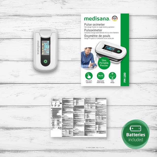 • Slank ontwerp dankzij één batterij tijdens gebruik - met een gewicht van slechts 36 g inclusief batterij is de PM 180 bijzonder licht en handig. Naast de pulsoximeter bevat de levering ook een polsband, een etui en een batterij. Het apparaat is dus direct klaar voor gebruik. Het gecertificeerde medische apparaat biedt een betrouwbare en gebruiksvriendelijke oplossing voor iedereen die zijn gezondheid eenvoudig en gemakkelijk wil controleren.