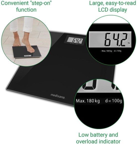 • De glazen personenweegschaal PS 400 van medisana, een van de toonaangevende specialisten op de thuiszorgmarkt, is een betrouwbare partner voor dagelijkse gewichtscontrole. Dankzij het bijzonder platte design is de medisana PS 400 glazen weegschaal een moderne blikvanger voor elke badkamer.
