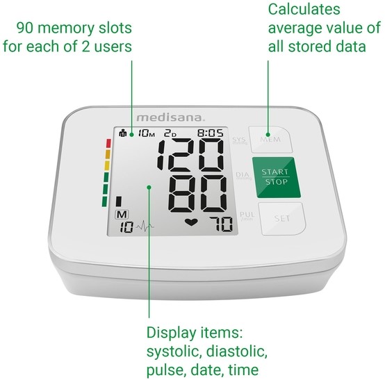 • De BU 512 bovenarmbloeddrukmeter van medisana maakt indruk met zijn ongecompliceerde bediening. Het digitale display informeert u in één oogopslag over de datum, tijd, polsslag, systole en diastole. De huidige meetwaarden worden geëvalueerd met behulp van een stoplichtkleurenschaal. Indien gewenst kan het apparaat een gemiddelde waarde berekenen van alle opgeslagen metingen. De BU 512 bovenarmbloeddrukmeter van medisana heeft ook een display dat een onregelmatige hartslag kan aangeven.