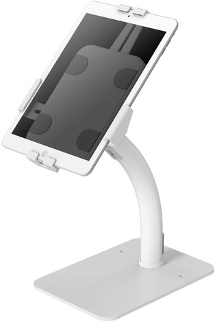 • De Neomounts DS15-625WH1 is een tafelblad tablethouder die 360° kan roteren, zodat eenvoudig geschakeld kan worden tussen portrait en landscape oriëntatie. Daarnaast kan de tablethouder +20°/-110° kantelen voor een comfortabele kijkpositie. Met behulp van de schuifrail aan de achterzijde kan de tablet in het midden van de steun worden uitgelijnd. De tablethouder is voorzien van een anti-diefstalslot en een schroefbare basis voor extra veiligheid. Anti-slipkussentjes beschermen de tablet tegen eventuele krassen, terwijl de in hoogte en breedte verstelbare klemmen zorgen voor een veilige en solide plaatsing van het apparaat. De bovenzijde is voorzien van een uitsparing voor de camera van de tablet. Kabels kunnen netjes worden weggewerkt via het interne kabelmanagementsysteem. De DS15-625WH1 is geschikt voor tablets met een dikte van 0-8,5 mm.