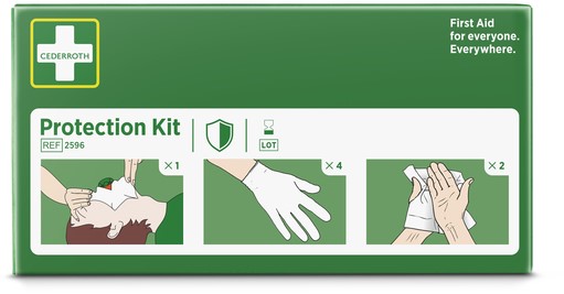 • Inhoud: 1 st. beademingsmasker met terugslagklep 4 st. handschoenen 2 st. Cederroth Safety Hand Cleanser (bevat 70% alcohol).