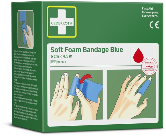 • Cederroth Soft Foam Bandage Blue 4,5m fungeert zowel als pleister als verband en is geschikt voor kleinere wonden. Gemakkelijk aan te brengen op vingers, handen, armen, tenen, voeten en benen enzovoort. Het verband is geschikt voor alle typen kleine wonden onafhankelijk van warmte, koude, natheid of droogte en blijft zitten, zelfs in water.