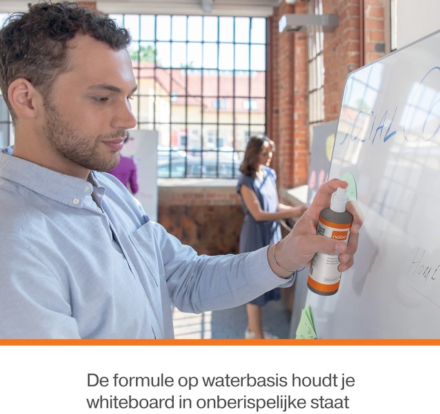 • Voor optimaal resultaat, gebruik je de reinigingsspray het beste met een Nobo whiteboardwisser