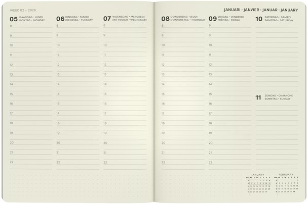 Met deze praktische QC Colour office agenda, hou je al je afspraken overzichtelijk bij de hand, en heb je dankzij het grotere formaat plaats genoeg om alles te noteren. Binnenin vind je telkens 7 dagen op 2 pagina's ingedeeld van 8h tot 22h en ruimte voor notities. Het binnenwerk is in het Nederlands, Frans, Engels en Duits. De harde kaft heeft een matte finish, afgeronde hoeken en een elastische sluiting.