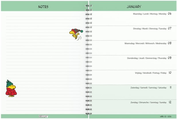 Kick Back & Relax! Met deze vrolijke Peanuts wire-o bureau agenda, hou je al je afspraken overzichtelijk bij de hand, en heb je dankzij het grotere formaat plaats genoeg om alles te noteren! Dankzij de wire-o ligt deze agenda mooi open en kan je makkelijk op beide pagina's schrijven. Binnenin vind je full coulour pagina's, met telkens 7 dagen op 2 pagina's, een jaar- en maandplanner en ruimte voor nota's. Het binnenwerk is in het Nederlands, Frans, Duits en Engels.
