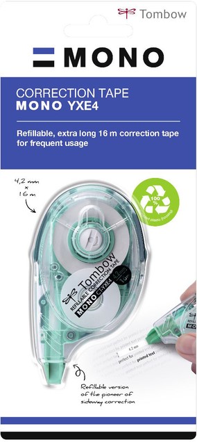 • De tape hecht goed op papier en laat niet gemakkelijk los bij overschrijven. Het heeft een controlesysteem om losse tape indien nodig strak te trekken. MONO YXE heeft geen droogtijd en kan direct en schoon worden overschreven. Geen kopie- of faxschaduwen. Behuizing gemaakt van 100% gerecycled plastic. Eenvoudig navulbaar.