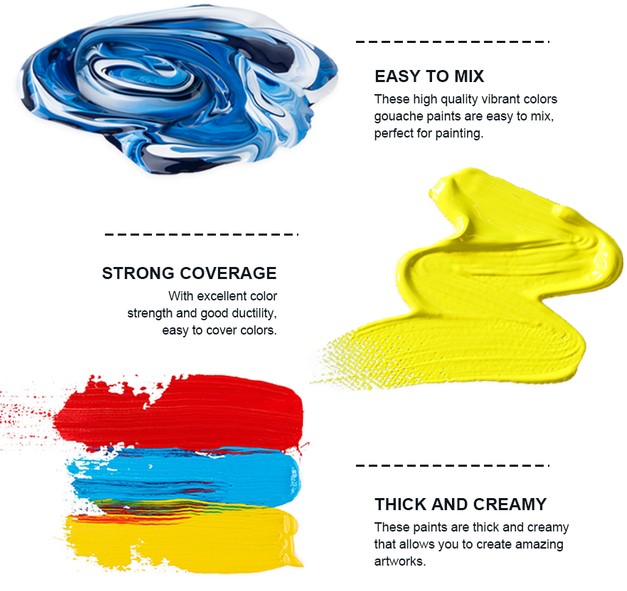 Gouacheverf behoort tot de serie wateroplosbare verf. Deze verf is gemaakt van dezelfde bindmiddelen en pigmenten als waaruit waterverf is samengesteld. Gouache heeft als toevoeging blanc fixe wat de verf zijn dekking geeft. Dit is ook meteen het verschil met aquarelverf. Door de dekkracht kan met gouache meer pasteus worden geschilderd. De dekkracht maakt het ook makkelijker om correcties te maken en kan je met lichte kleuren over donkere kleuren schilderen in tegenstelling tot aquarel. Bij aquarel zal de transparantie ervoor zorgen dat lichte kleuren de donkerder schaduwen die eronder liggen niet zullen bedekken. Met deze kleuren kun je prachtige kleurencombinaties maken. De gouache is een dekkende verf waarmee je mooie, streeploze en matte oppervlakken kunt schilderen. De verf is waterverdunbaar en droogt binnen enkele minuten, dus je kan lekker vlot doorwerken. Te gebruiken op verschillende ondergronden zoals papier, karton en hout.Elke kleur heeft een inhoud van 30 ml. En heeft een fantastische dikke consistentie die penseel- of spatelafdrukken zal vasthouden en je werk schitterende textuur zal geven. De premium gouache-verfset met 18 unieke opvallende levendige gouache kleuren biedt je een uitstekende selectie van levendige kleuren om je kunstwerk tot leven te brengen, ideaal voor professionele kunstenaars, jonge aspirant-kunstenaars, schilderliefhebbers, tieners en kinderen. Verbeterd en uniek ontwerp met minicups met uitstekend afdichtingsdeksel houdt je gouache-verf nat en romig voor prachtige schilderwerkjes, draagbaar formaat, gemakkelijk mee te nemen, perfect om binnen of buiten te leren schilderen. Gemaakt van milieuvriendelijk verfmateriaal met de certificeringen ACMI, EN71-3 en EN71-9. De gouache-verf van deze set heeft rijke pigmenten, is romig, niet giftig en wasbaar. Geschikt voor kunstenaars, volwassenen, tieners en kinderen. De verf zal niet barsten of afbrokkelen wanneer ze droog is en kan worden gereactiveerd met water. De nieuwe gouache-verfset wordt geleverd met een eenvoudig palet.