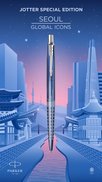 In navolging van de recente tournee langs wereldberoemde steden, gaat de Jotter Special Edition ‘Global Icons’-collectie naar vier nieuwe opwindende bestemmingen in de wereld. De fascinerende en dynamische sfeer die deze stad bij het vallen van de avond oproept vormt de inspiratie voor de Jotter Special Edition Seoul. Het verlichte spektakel van de vele iconische en futuristische bezienswaardigheden en de strakke wolkenkrabbers en prachtige innovatieve bouwwerken van de stad komen samen om het unieke patroon te creëren. Met het vakmanschap van Parker is het ontwerp vakkundig in de huls van dit fijne schrijfinstrument gelaserd. Een indigo gelakte afwerking, de soepele schrijfervaring en de kenmerkende klik van de Jotter maken de pen compleet. Voor elke reiziger die begint aan een reis met luxe schrijfwaren zal de Jotter Special Edition Seoul hen de weg wijzen.