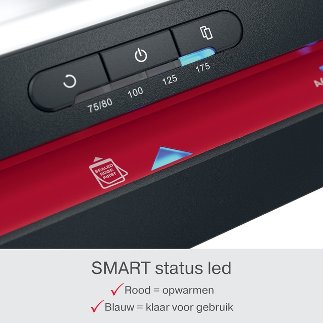 • SMART status led: brandt rood tijdens het opwarmen en wordt blauw met een geluidssignaal wanneer de lamineermachine klaar is voor gebruik.