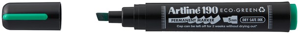 Ecologische Permanent Marker gemaakt uit 64% gerecycled materiaal met Dry-Safe inkt die 2 weken zonder dop kan blijven zonder uit te drogen. Beitelpunt 2-5mm. Kleur : groen. Gecertifieerd door Eco Mark-label. Post consumer recycled plastic.