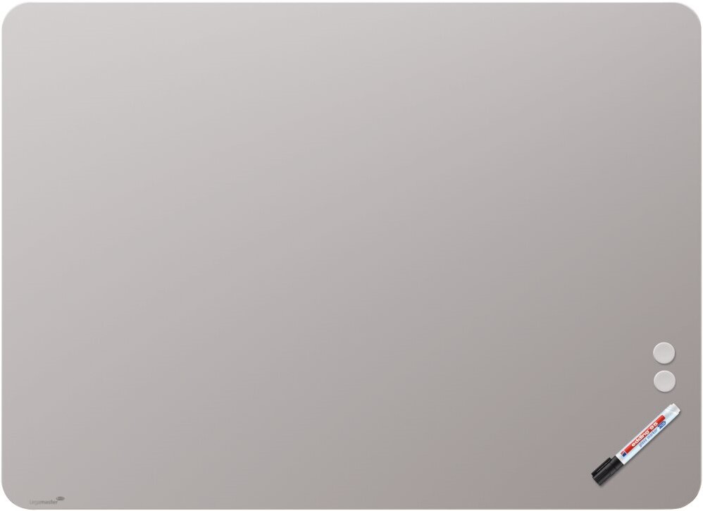 RC mat glasbord 90x120cm warm grey A Hoogwaardig frameloos glasbord voor langdurig, intensief gebruik A Geschikt om met krijtmarkers of droog uitwisbare whiteboard markers te beschrijven A Gehard veiligheidsglas en magnetisch glazen oppervlak (4 mm) A Kan horizontaal of verticaal worden bevestigd A Echte schrijfervaring dankzij mat oppervlak A Inclusief 2 supersterke magneten (diameter: 30 mm), 1 edding 95 glassboard marker A RC = afgeronde hoek